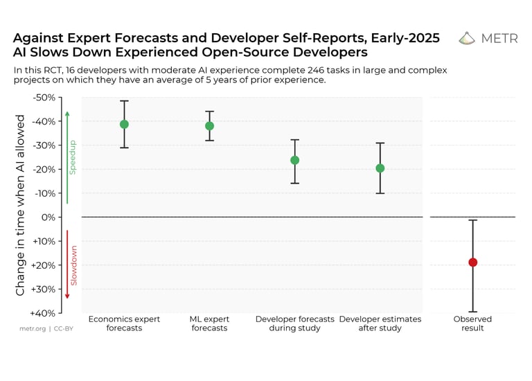 Human perception biases: Looking at the risks of AI hype. Metr, a research org studying AI capabilities, found that experienced developers using AI tools took 19% more time, despite a perceived 20% efficiency gain