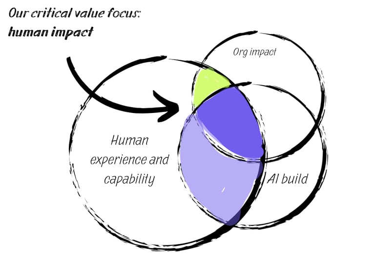We partner with you whether you're already midway through your journey, or on the other side of change - to figure out where you've created both opportunity and risk in enabling AI in your business model, and how to optimise for human connection and skills to benefit from both human and tech value - and realise new potential.